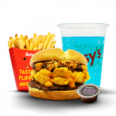 Crispy Pringles® coated chicken tenders made to order, crunchy, juicy, and packed with Betsy’s signature flavour. Pick your rub and dive in. *HOT & HOT AF RUB DISCLAIMER: By ordering, you accept full responsibility for any burning, sweating, crying, sauce explosions, or regret. If you’ve got spice sensitivity, tell us first, eat at your own risk.