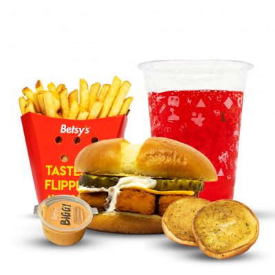 Golden buttermilk chicken smothered in Southern Comeback sauce, topped with lettuce and cheese, then finished with your favourite Betsy’s rub. Available single or double. *HOT & HOT AF RUB DISCLAIMER: By ordering, you accept full responsibility for any burning, sweating, crying, sauce explosions, or regret. If you’ve got spice sensitivity, tell us first, eat at your own risk.